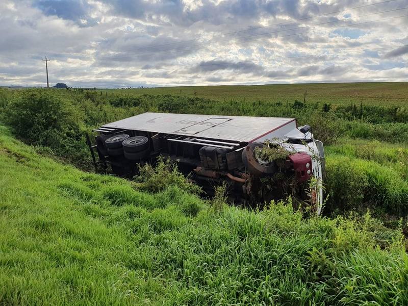 | Caminhão tombou à beira da rodovia após a batida ?? Foto: Eduardo Andrade/RPC |