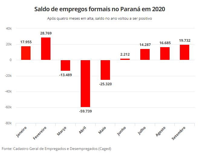O Paraná registrou, em setembro, o quatro mês seguido com saldo positivo na criação de empregos, de acordo com dados divulgados pelo Cadastro Geral de Empregados e Desempregados (Caged), do Ministério da Economia, na quinta-feira (29).