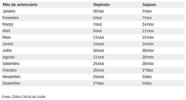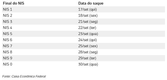 Os saques serão liberados a cada dia útil de acordo com o dígito final do NIS, seguindo o calendário abaixo:
