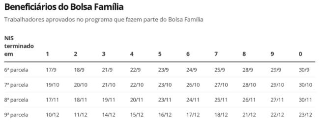 Neste grupo, estão 1,6 milhão de trabalhadores que fazem parte do Bolsa Família, cujo número do NIS é terminado em 8. Também fazem parte 7,8 milhões de trabalhadores que estão no Cadastro ?nico e aqueles inscritos por meio de aplicativo, site ou pelos Correios, aniversariantes em outubro e novembro.
